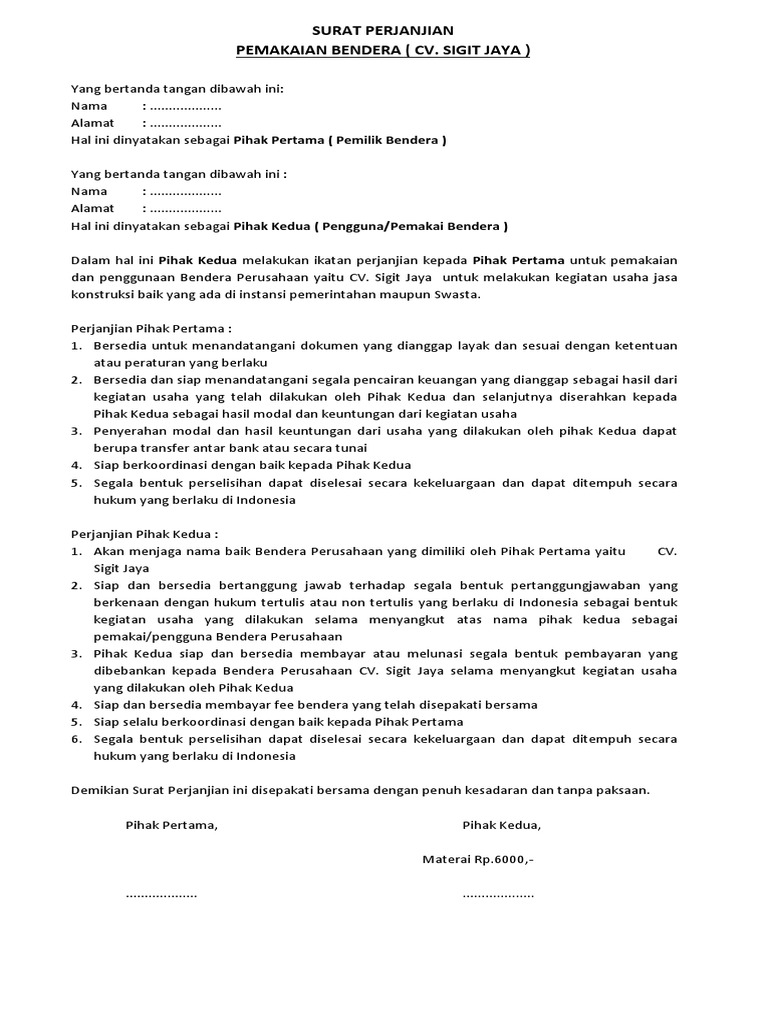 Contoh surat perjanjian yang baik dan benar dapat kamu gunakan sebagai referensi dalam menyusunnya. Berkewajiban membayar kerugian pengelolaan usaha kepada pihak kedua sehubungan dengan pembatalan akad syarikat yang disebabkan oleh pelanggaran pihak pertama terhadap isi syarikat Surat perjanjian jual beli tanah. Perkongsian perniagaan ini akan didaftarkan atas nama syarikat aaa enterprise. Dari pengertian, contoh, hingga cara membuatnya.